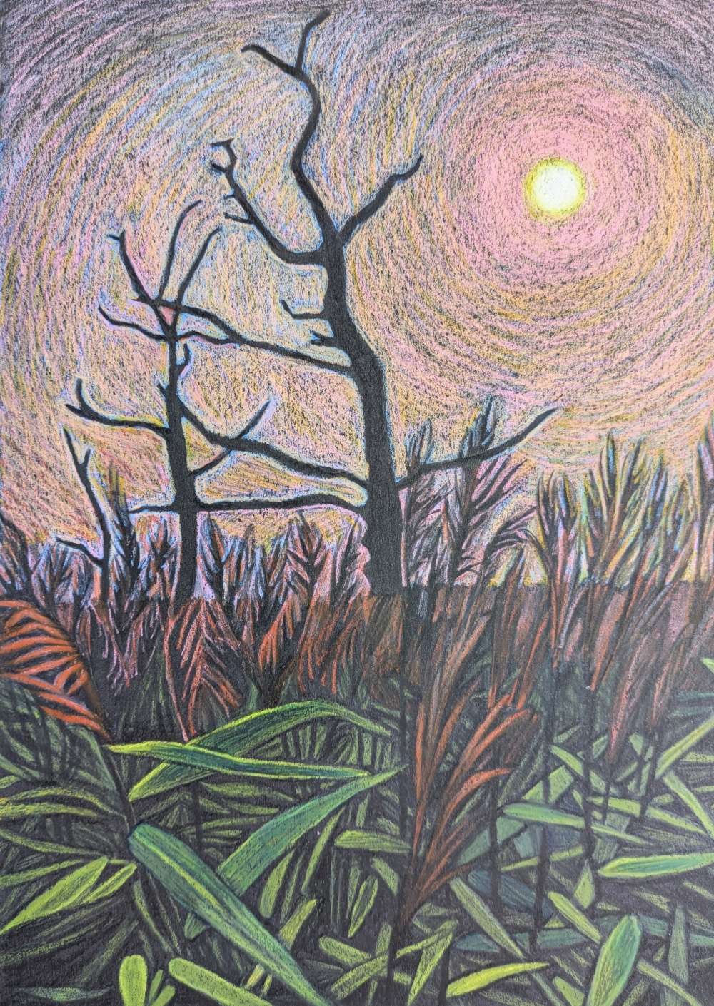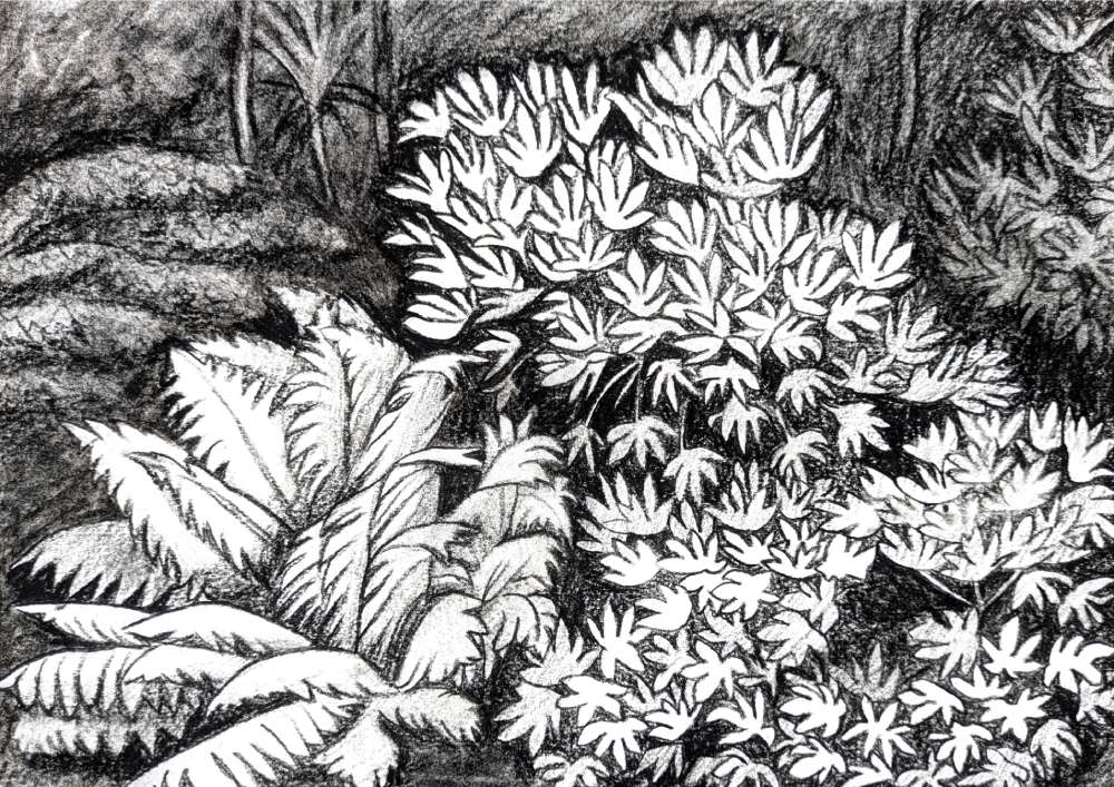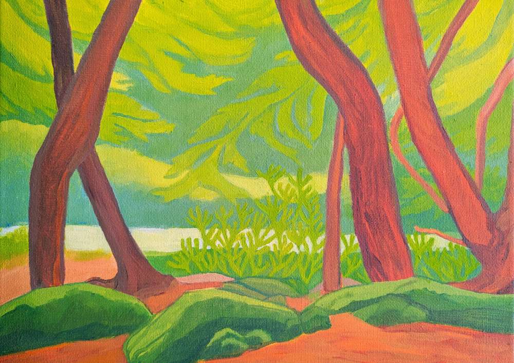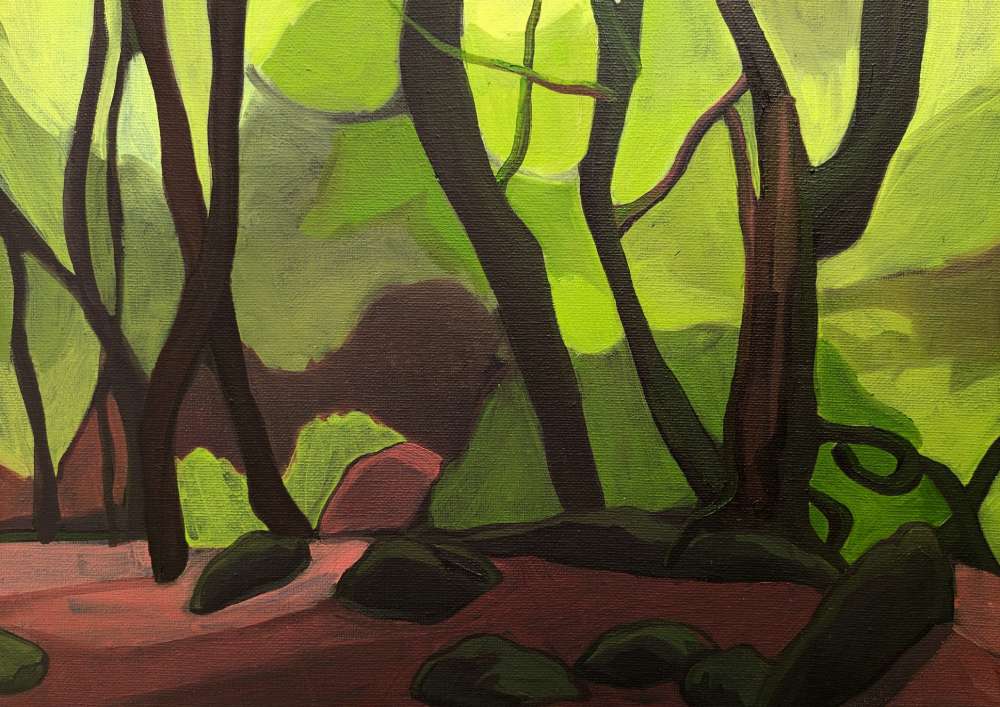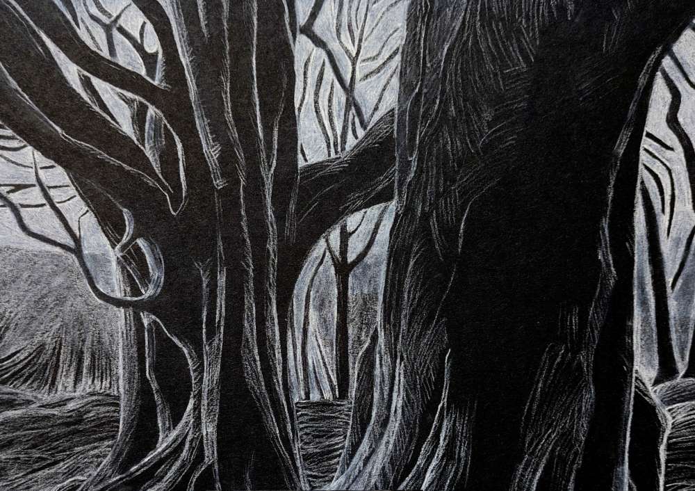 “Originally from Essex I have always been drawn to the wild moors and coastline of Devon and Cornwall, and moved to Cornwall, making it my home, in 2017. I feel a strong connection to this land and enjoy trying to capture its spirit, sound, silence, movement and stillness, as well as the personalities of its trees and rocks that form the main subject matter of my work.”